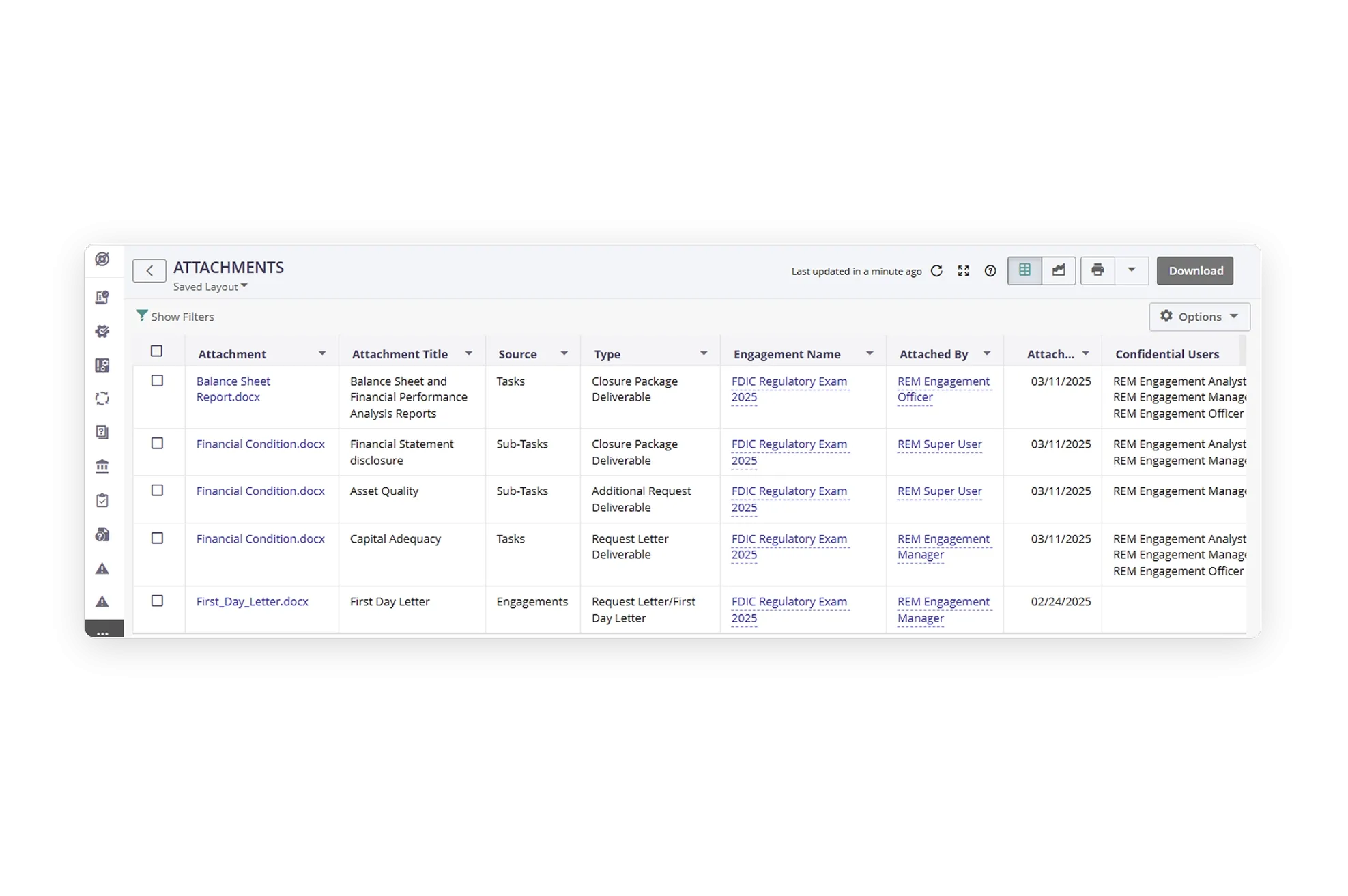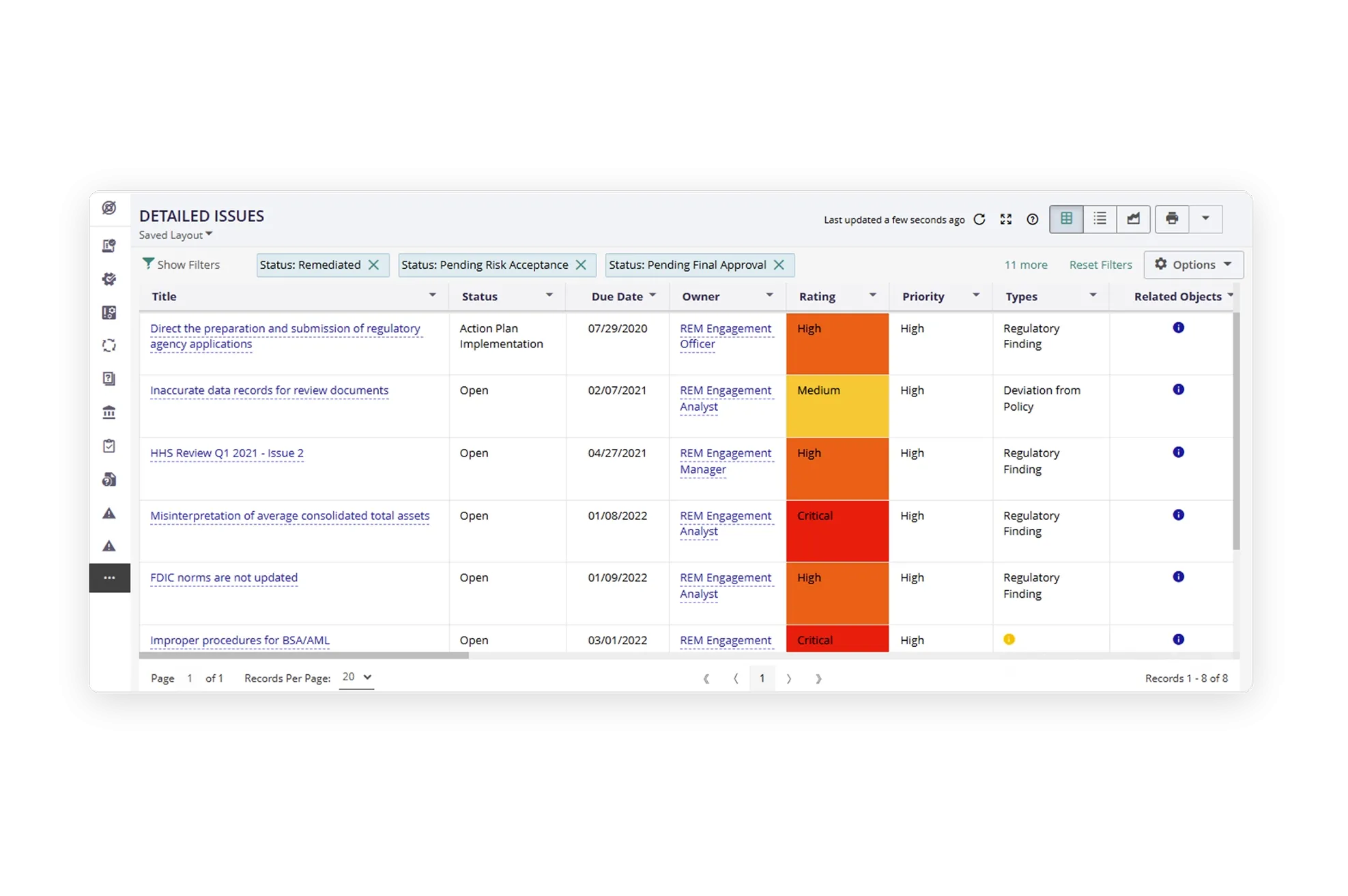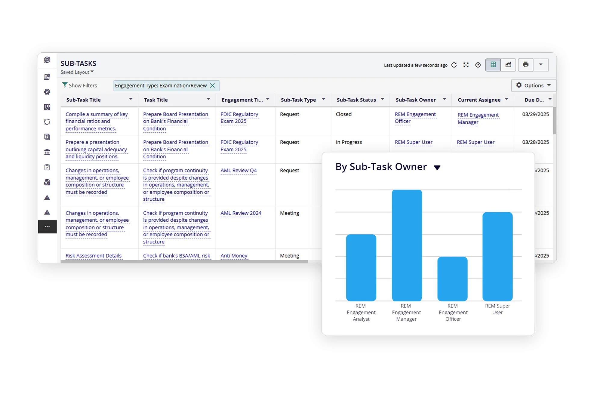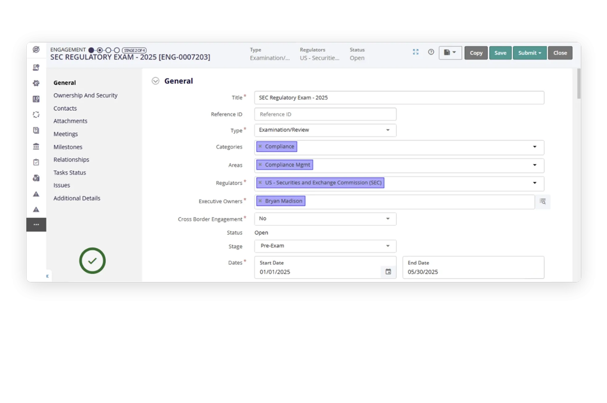 - Strengthen enterprise-wide coordination and tracking of regulatory engagements. Securely manage documentation and findings, analyze data for trends, and enhance transparency and accountability by mapping each engagement to tasks, owners, and timelines for improved oversight and outcomes.